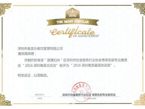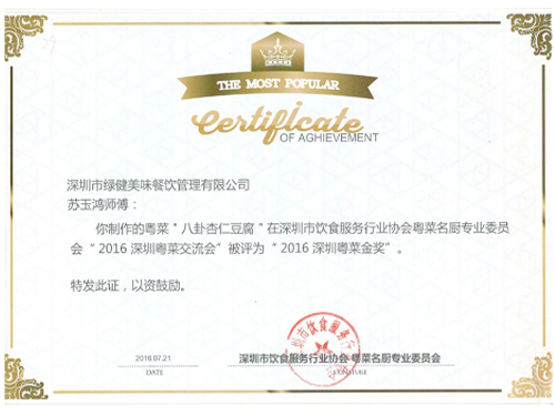 我司研發(fā)部丁總帶隊(duì),攜大廚蘇玉洪、黃燕周參加了由深圳市飲食服務(wù)行業(yè)協(xié)會粵菜名廚專業(yè)委員會舉辦的“2016深圳粵菜交流會”。我司大廚蘇玉洪制作的"八卦杏仁豆腐"、黃燕周制作的“如意蝦燈”及“蓮蓬扣肉”被評為2016年深圳粵菜金獎。